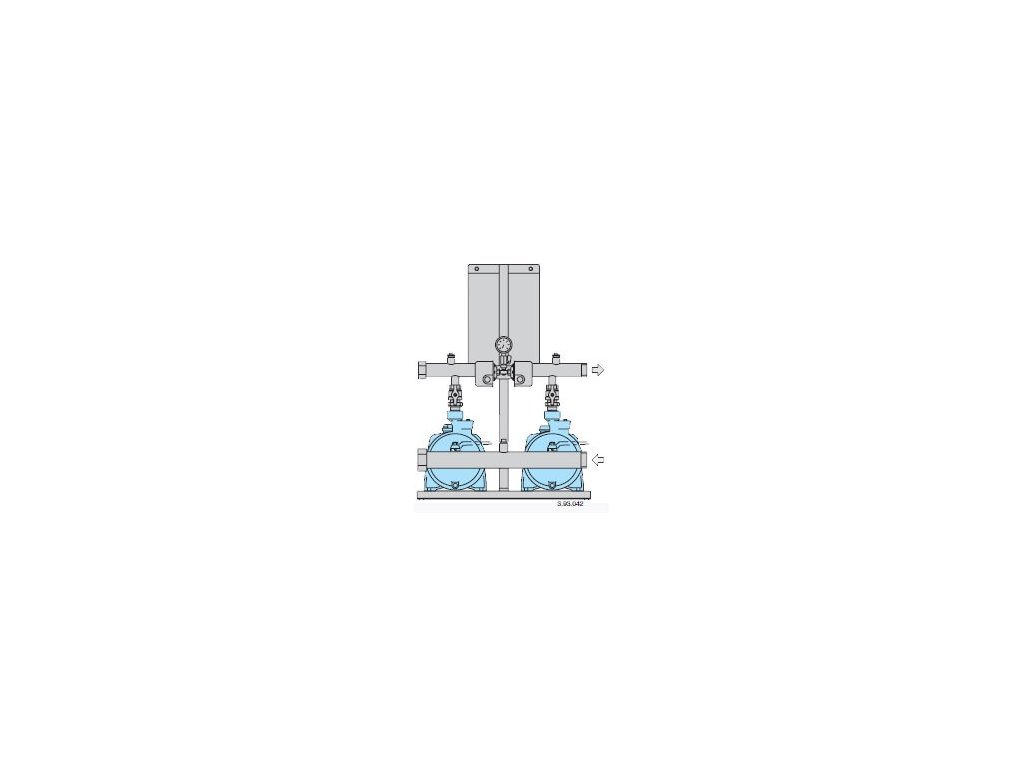 - Podle požadavků na průtok jsou čerpadla, jedno s proměnnými otáčkami a druhé s konstantními otáčkami, spouštěna tak, že zajišťují potřebné množství vody při stálém tlaku