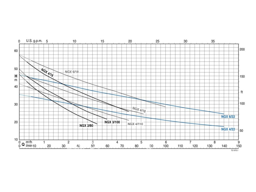 - Lepší samonasávání - čerpadla verze NGX 3 a 4 nasávají vodu z hloubky 9,5 m za méně než 2 minuty, tato vlastnost umožňuje použití čerpadla s dlouhým sacím potrubím a bezpečný provoz při instalacích s běžnou nasávací výškou v nepříliš hlubokých vrtech také s dlouhým sacím potrubím na hladinou vody