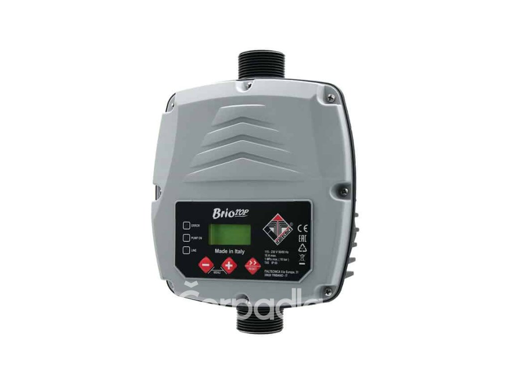 Demontovatelná zpětná klapka. Ochrana čerpadla proti suchoběhu. Přípojka G5/4". PN 10 bar. Prostor pro vložení rozběhového kondenzátoru max. L130/ Ø 50 mm. Pomocný kontakt, např. pro externí ochranu či dálkové ZAP/VYP. Pro čerpadla na 1x230 V, jm. proud max 16 A.