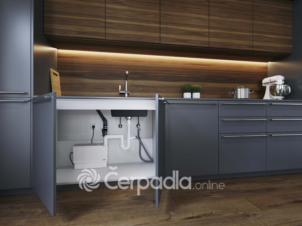Kompaktní přečerpávací stanice připravená k zapojení pro odvodnění umyvadel, sprch, van a WC.